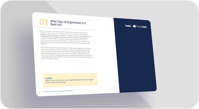 What Type of Organization is it 01Built For? Owners, Contractors and Design organizations have different needs and require different capabilities in their construction management software. For example, owners typically are looking for program management software that is designed to cover the entire project lifecycle including capital planning, design, procurement, construction and facility commissioning. In contrast, contractors often are looking for solutions that manage the process of pre- construction, construction and close-out. To date, no single solution has been able to meet the requirements of each party and the technology vendors have specialized solutions for each stakeholder. Don’t be fooled by software vendors that position a single software application as being able to meet the requirements of the owner, designer, contractor and specialty contractor. Why is this so important? Owners seek to deliver projects on-time, on-budget, and within scope while minimizing changes. Contractors in contrast seek to deliver the project on-time, with profit and are flexible to changes provided they are adequately compensated. These divergent requirements drive specialized features that would be in conflict with one another if they were in the same software solution. ACTION: Ask your vendor: Who was this solution originally developed for? If they struggle to answer the question, keep looking. 5 Factors You Must Consider in a Project Management Software Provider