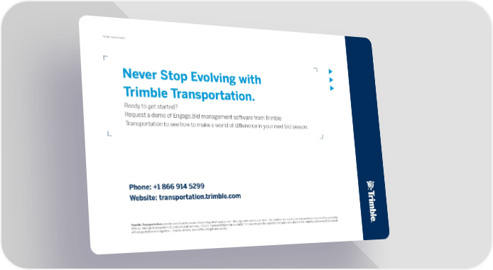 15 Trimble Transportation Bid Don’t Bet Never Stop Evolving with Trimble Transportation. Ready to get started? Request a demo of Engage.Bid management software from Trimble Transportation to see how to make a world of difference in your next bid season. Phone: +1 866 914 5299 Website: transportation.trimble.com Trimble Transportation provides solutions to create a fully integrated supply chain, helping customers make more informed decisions and maximize performance, visibility and safety. With an intelligent ecosystem of products and services, Trimble Transportation enables customers to embrace the rapid technological evolution of the industry and connect all aspects of transportation and logistics — trucks, drivers, back office, freight and assets.