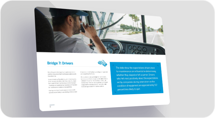12 Trimble Transportation Bridge the Divide Recruiting and retaining drivers and technicians is another area where fleet maintenance adds value to the enterprise. A recent study by Stay Metrics, a firm that provides driver surveys and other retention products, shows the impact of fleet maintenance on driver turnover. The study compared survey responses with turnover for maintenance-related survey questions. Sharing visibility of maintenance schedules with operations and safety is one strategy fleets can use to increase job satisfaction by creating a personalized work experience for drivers. When a driver is passing through for maintenance, technicians and fleet managers can be automatically notified of the events. This visibility can help build relationships. The driver can be greeted by name and recognized for recent accomplishments from data that is being collected from various systems. Bridge 7: Drivers The data show the expectations drivers have for maintenance are influential in determining whether they stayed or left a carrier. Drivers who felt most positively about the expectations set by companies during orientation on the condition of equipment are approximately 9.2 percent less likely to quit. Trimble Transportation Bridge the Divide