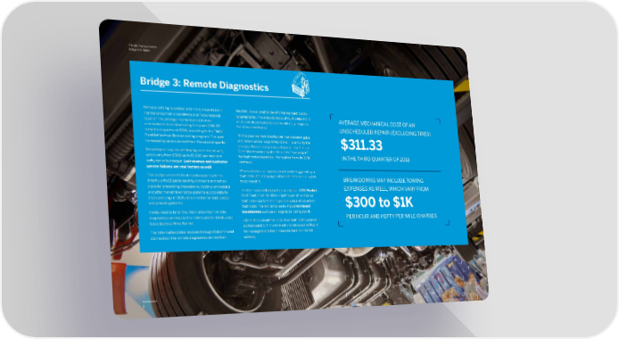 8 Trimble Transportation Bridge the Divide Bridge 3: Remote Diagnostics 8 AVERAGE MECHANICAL COST OF AN UNSCHEDULED REPAIR (EXCLUDING TIRES) $311.33 IN THE THIRD QUARTER OF 2018 BREAKDOWNS MAY INCLUDE TOWING EXPENSES AS WELL, WHICH VARY FROM $300 to $1K PER HOUR AND HEFTY PER-MILE CHARGES Navistar, is analyzed to identify the top fault codes by geography. The analysis looks at fault codes from a nationwide perspective and by individual regions, terminals and trucks. “In the past we have blasted our maintenance guys with information,” says Mike Palmer. To simplify the process, the company uses a feature in its Trimble Fleet Maintenance system to create “campaigns” for fault codes based on information from its OEM partners. When a technician opens a work order triggered by a fault code, the campaign informs the technician what to do about it. Trimble Transportation offers a product, TMT Predict . Fault Code, that identifies eight types of “red lamp” fault codes up to three days in advance of an actual fault code. The red lamp codes signal imminent breakdowns such as an engine de-rating event. Information about the predictive fault codes appear in a dashboard in Trimble’s fleet maintenance software for managers and technicians to take immediate actions. Perhaps nothing is costlier and more preventable in maintenance than breakdowns and “unscheduled repairs.” The average mechanical cost of an unscheduled repair (excluding tires) was $311.33 in the third quarter of 2018, according to the TMC/ FleetNet Vertical Benchmarking program. The cost increased by seven percent from the second quarter. Breakdowns may include towing expenses as well, which vary from $300 up to $1,000 per hour and hefty per-mile charges. Lost revenue and customer service failures are cost factors as well . This bridge connects fleet maintenance systems directly with OEMs to identify problems and action plans for preventing breakdowns. Factory-embedded and aftermarket telematics systems supply data to truck and engine OEMs who monitor for fault codes and provide guidance. Fleets need to tailor the information from remote diagnostics services to their own specific needs, says Estes Express’ Mike Palmer. The information Estes receives through OnCommand Connection, the remote diagnostics service from Trimble Transportation Bridge the Divide