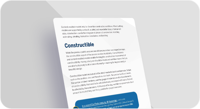 How the Constructible Process Will Transform 2020 8 Constructible While the previous points uncover new efficiencies in their own respective ways, the constructible aspect of the process involves buildability. Connectedness and content-enabled models enable the tangible, construction improvement of constructibility. Having a truly constructible model and workflow means that you are able to physically build a vision into reality— reaching far beyond simply a beautiful design. Constructible models include all of the detail needed to build and fabricate. Details such as the position, size, and thread-count of bolts, the precise location of welds, the camber of steel members, and the gauge of materials are all critical elements of constructibility that need to be articulated early and shared with teams that will be affected by these decisions. At the end of the day, workflow improvements don’t amount to much if they can’t truly yield better project execution. Content-enabled models help to streamline construction workflows. When building models are supported by a robust, curated, and repeatable library of detail-rich data, stakeholders can better integrate all phases of construction, including estimating, detailing, fabrication, installation, and building. In a recent ConTech study by JB Knowledge , contractor respondents said that even though they have a VDC (Virtual Design & Construction) staff, only 36% of their active projects involve BIM. Furthermore, confidence amongst respondents in the ability to maximize BIM decreased from a score of eight in 2017 to a score of seven in 2018. With this reduced confidence from the previous year, there is no better time to educate future generations and train our crews to move beyond BIM.