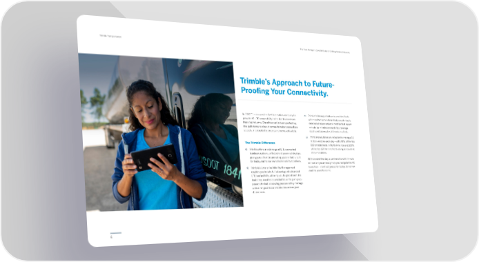 6 Trimble Transportation The Fleet Manager’s Essential Guide to Evolving Wireless Networks In 2017, Trimble was the first telematics company to provide 4G LTE connectivity in the North American trucking industry. Since then we’ve been perfecting the path forward when it comes to faster connection speeds, improved efficiencies and increased safety. The Trimble Difference | Trimble offers a wide range of LTE-connected hardware options, with Android-powered displays, giving you a flexible operating system that is built for today and tomorrow’s fleet mobility solutions. | Trimble’s Enterprise Mobility Management enables you to take full advantage of advanced LTE connectivity, allowing you to give drivers the tools they need to be productive while giving you peace-of-mind in knowing you can safely manage a wide range of apps and devices across your driver base. Trimble’s Approach to Future- Proofing Your Connectivity. | Trimble’s Managed Network provides fleets with monitoring solutions that provide highly detailed wireless network metrics that report minute-by-minute connectivity, coverage depth and latency for all trucks in a fleet. | Trimble’s solutions are relied on to manage 3.1 million vehicles each day – with 78% of the top 100 private fleets in North America and 100% of the top 100 for hire fleets using at least one of our solutions. At the end of the day, a partnership with Trimble will not only seamlessly help you navigate the 4G transition – it will set you up for today, tomorrow and the years to come.