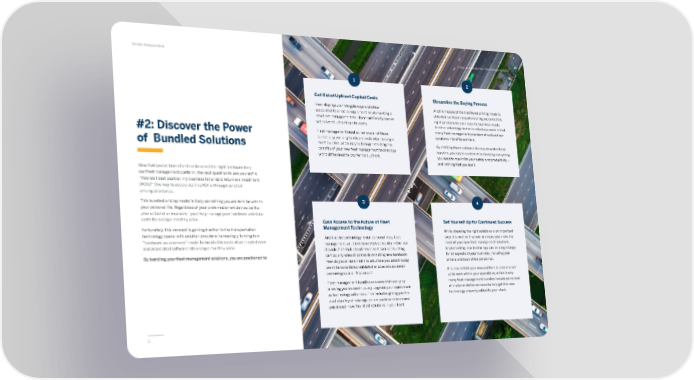 5 Trimble Transportation 5 Ways to Maximize Your Fleet Management ROI Now that you’ve taken the time to select the right hardware for y our fleet management platform, the next question to ask yourself is “How do I best position my business for a rapid return on investment (ROI)?” One way to accelerate this ROI is through bundled pricing structures. This bundled pricing model is likely something you are familiar with in your personal life. Regardless of your preferred smart device, be it a phone, tablet or wearable - you likely manage your hardware and data costs for a single monthly price. Fortunately, this concept is gaining traction in the transportation technology space, with solution providers increasingly turning to a “hardware-as-a-service” model to bundle the costs of an in-cab device and associated software into a single monthly price. By bundling your fleet management solutions, you are positioned to: #2: Discover the Power of Bundled Solutions From displays, vehicle gateways and other associated telematics equipment, implementing a new fleet management solution traditionally comes with a lot of upfront capital costs. Fleet management bundles remove all of these burdens by working hardware costs into the single monthly price, allowing you to begin realizing the benefits of your new fleet management technology without the need to pay for it all upfront. Get Rid of Upfront Capital Costs Another hassle of the traditional pricing model is potential confusion about ensuring you select the right solutions for your specific business needs. Another advantage to the bundled approach is that many fleet management providers structure their solutions into different tiers. By distilling these options into easy to understand bundles, you can be confident in choosing everything you need to maximize your safety and productivity ‒ and nothing that you don’t. Streamline the Buying Process Just like the technology in our personal lives, fleet management solutions have evolved rapidly in the last decade. This fast-paced movement can be daunting, particularly when it comes to selecting new hardware. How do you ensure that the solutions you select today won’t be considered outdated or obsolete as newer technologies are introduced? Fleet management bundles can ease that worry by allowing you to continuously upgrade your equipment as technology advances. This includes giving you the predictability of new equipment each term to ensure you always have the latest solutions in your fleet. Gain Access to the Future of Fleet Management Technology While choosing the right solutions is an important step, it is not the final one to ensure you make the most of your new fleet management solutions. Implementing new technology can be a big change for all aspects of your business, including your drivers and back office personnel. It is crucial that your new platform is properly set up to work within your operations, which is why many fleet management bundles include some level of implementation services to help get this new technology properly added to your stack. S et Yourself Up for Continued Success 1 2 4 3