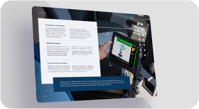 No one likes paperwork but the process can be streamlined with an electronic scanning solution in the cab. Providing drivers with a scanning platform can help simplify the document management process, with barcode scanning and pre-filled data fields to make scanning documents easier and eliminate manual steps for drivers. Adding this capability can also help you collect documents to not only improve back office By taking a more holistic approach to your new technology investment, you can identify and uncover new opportunities to make the most of this change to enhance how your business operates. And, in some cases, it doesn’t require any additional hardware to enable these services within your fleet. Weigh station bypass programs are a tool to help fleets with positive safety track records to potentially skip a weigh station along a route. The technology enables law enforcement to examine key data points, empowering inspection personnel to let safer fleets continue down the road and instead focus their efforts on potentially unsafe trucks or carriers. For fleets like yours, this means eliminated route delays, improved operational efficiencies and an enhanced driver experience. Weigh Station Bypass It’s not just important to know the final destination of a load but how to get there. Adding in a commercial grade in-cab navigation platform can enhance driver efficiency, reduce out of route miles and increase overall fuel economy. Unlike consumer-focused solutions, commercial navigation is built for trucking, featuring guidance to commercial locations with truck entry and exit gates as well helping eliminate delays, unsafe driving conditions and dangerous vehicle maneuvers. Commercial In-cab Navigation Regulatory compliance for your fleet extends beyond just Hours of Service (HOS). Adding in an electronic fuel tax reporting platform can bring together data points related to GPS, ECM odometer readings and fuel purchases. Automating the process takes IFTA returns off your hands and helps to enable hassle-free compliance for your business. Full-service Fuel Tax Reporting 7 5 Ways to Maximize Your Fleet Management ROI Trimble Transportation