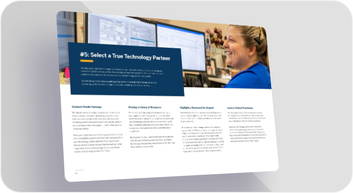 10 Rolling out new technology in phases can be beneficial to the end user. Consider identifying a pilot terminal that can serve as beta testers for your new solutions, including how the displays function and how to perform common tasks within the system -- both in the cab and in the back office. While you might have some training personnel in-house, it is important to supplement them with resources from your technology partner. Monitor this program over the course of 2-3 weeks to see what worked well, what might need refinement and begin to plan additional rollouts and trainings at other terminals. While initial training can go a long way in helping end users, questions are likely to come up as they work within the new solutions. It is crucial that you work with your technology provider to supplement training with documentation and other self-serve resources to help answer common questions drivers and other users might have. By empowering your users to self-serve, they are less likely to need assistance and more likely adopt the technology because they have access to the resources they need to be successful. Even with extensive training and a vast collection of self- serve resources, questions will still come up. It is smart to anticipate these questions and develop a framework to address them. What does your fleet management vendor’s support system look like? Who should your employee call when issues arise? Ensure they are able to provide you and your drivers with support when they need it, both through a dedicated support team available 24/7/365 and via a team of Customer Success Managers. Identify how your technology provider operates and document an escalation process so that everyone at your fleet is aware of who to turn to when they need assistance. It is also a good practice to evaluate your capacity to manage these installations in house. Involve your maintenance and operations teams to see how best to work installations into their existing workflows. Does your technology partner offer installation services? Outsourcing this work can help take the burden of installations off of your fleet, relying on a team of expertly trained technicians who specialize in installing this type of equipment and can do so on a schedule that best fits your fleet’s needs. 5 Ways to Maximize Your Fleet Management ROI Trimble Transportation Develop a Library of Resources Highlight a Framework for Support Lean on Trained Technicians Conduct Onsite Trainings Identifying the right fleet management solutions is an important milestone but so is ensuring you select the right technology partner. By ensuring you have the support in not only implementing the solutions but using them will be a key variable in determining your technology ROI. So, how do you know if you are getting a true partner? Consider the following items when evaluating a potential fleet management vendor, including how they can help you: #5: Select a True Technology Partner