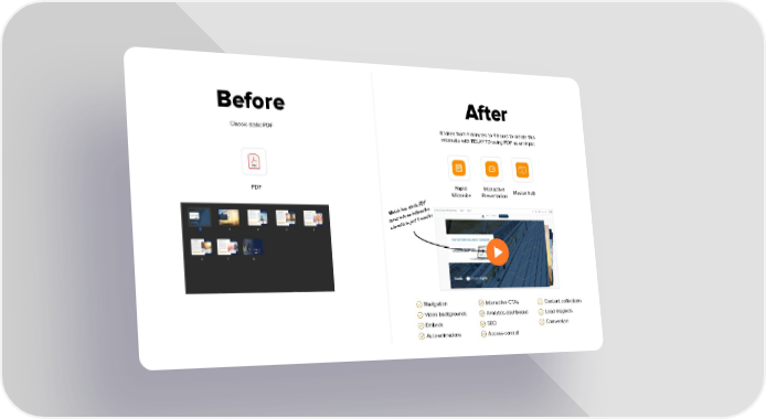 Before After Classic static PDF It takes from 4 minutes to 4 hours to create this microsite with RELAYTO using PDF as an input Rapid Interactive PDF Master hub Microsite Presentation F active Watch how static PD turns into an inter microsite in just 4 minutes Navigation Interactive CTAs Content collections Video backgrounds Analytics dashboard Lead magnets Embeds SEO Conversion Auto-animations Access-control