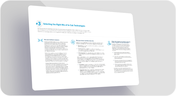 #3 Selecting the Right Mix of In-Cab Technologies Now that you have the operating system identified and a device management process in place, how do you choose the right type of hardware for your in-cab experience? Just like the consumer hardware market, the choices for displays and other in-cab equipment are seemingly endless, so it is important to weigh your options by considering the following points: How your hardware connects: What your drivers’ workflow looks like: Which other benefits are available to help you It starts with determining how your vehicle’s hardware When it comes to selecting the displays themselves, you have a lot of justify an upgrade in in-cab connectivity? components will connect and communicate with choices to consider, too. The three main categories of displays are: In addition to thinking about the hardware itself, it each other and the back office. Some more basic | Proprietary: These displays are manufactured exclusively for your is equally important to consider what the hardware configurations connect the telematics box with the in- technology provider. can enable and how this can help you justify the cab display via Bluetooth, using the display’s wireless investment. By taking the time to invest in new network to connect each component. Another | Commercial: These displays are made by third-party technology, you should also look at the full range of common configuration is to use wireless connectivity manufacturers like Samsung and can be purchased either through options available from your technology provider. Do on both the telematics box and the in-cab display and your technology provider or off the shelf. they offer: pair them in the cloud. | Video and other safety-related technology to Both of these options present challenges: the first | Bring your own: The “bring your own device” (BYOD) model relies improve liability protection and driver coaching option depends on a less-than-reliable Bluetooth on your drivers to use their own cell phones or tablets as an in-cab opportunities? connection and the telematics box only works if display. the display is in the cab to connect to. Pairing the Which options does your technology partner offer? For enterprise | Truck-safe in-cab navigation to enhance driver telematics box and display in the cloud also presents fleets looking to have more control over the management of the efficiency, reduce out of route miles and increase challenges: since it relies on wireless networks, the displays and the user experience, proprietary and commercial grade overall fuel economy? box and display will not be able to communicate with choices are likely to make the most sense. Even these options come | Electronic scanning and document management each other if there are any disruptions in coverage. with many choices. When looking at display types, remember to to eliminate paperwork and streamline the flow of Instead, fleets should look at a more robust consider: information across your fleet? connection in the cab, leveraging wireless networks | Portability: Do your drivers do work outside the cab that requires | What integrations are available to other in-cab via the telematics box and connecting it to the in- electronic signature capture? What about electronic driver vehicle technology providers that might further improve cab display via Wi-Fi. Connecting via Wi-Fi not only inspection reports? If so, perhaps a portable tablet might be how your fleet and drivers operate? ensures a connection between the display and the preferred over a fixed-mount display. telematics box even in spotty coverage areas but it By taking a more holistic approach to your new enables you to connect a wide range of other on- | Toughness: Regardless of your fleet or load type, the trucking technology investment, you can identify and uncover vehicle components and gather additional data on industry can be a rugged environment to operate in. Do you new opportunities for further ROI and make the most vehicle and driver performance. operate in extreme weather conditions or in particularly tough of this change to discover additional ways to enhance conditions? If so, you may want to consider a ruggedized device how your business operates. that is built specifically for the rigors of the industry.