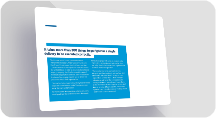 Heniff Harnesses the Trimble Platform to Evolve All Parts of their Business It takes more than 300 things to go right for a single delivery to be executed correctly. That is how Jeff O’Connor, president of Heniff but by leveraging a wide range of products under Transportation, sees it. And O’Connor would know. Trimble, they are able to avoid information silos Heniff is an Illinois-based fleet that has more than and bring these individual solutions together to the 1,100 trucks that deliver liquid bulk materials across benefit of their entire operation. the United States. In order to ensure that all of these “We’ve really taken a big approach on cross- steps go properly, Heniff relies on a wide range of integrating all those systems,” said Joe Neal, chief Trimble transportation solutions, both in-cab and in information officer for Heniff. “So anyone in our the back office, to gain visibility and to streamline organization, whether that’s a driver manager, processes across their organization. a dispatcher, a driver on the field, an executive “Trimble has helped us create visibility to all of those management team…we really want to give them steps and it’s automated a lot of those processes all the information at their fingertips, so they don’t along the way,” said O’Connor. have to go in ten different systems, five different For Heniff, other transportation solution providers systems – and I think that’s one of the things that’s could give them the solutions to meet their needs really helped us be so successful.”