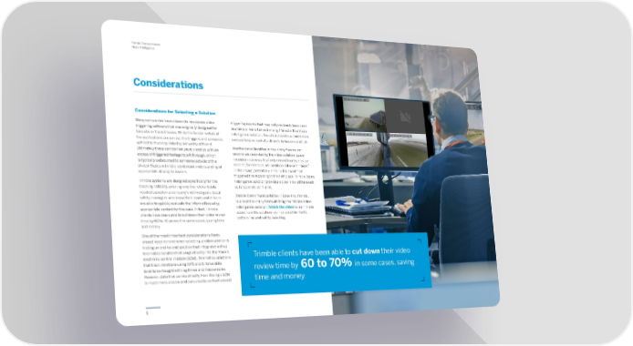 5 Trimble Transportation Video Intelligence Considerations triggering events that may not previously have been available or were flat-out wrong. Paired with a Video Intelligence solution, this data provides a much more comprehensive look at a driver’s behaviors and risk. Another consideration is how many frames per second are recorded by the video solution. Lower resolution cameras that only record four frames per second, for example, will produce video with “hops” in the image, potentially missing the event that triggered the recording in the first place. Trimble Video Intelligence solution provides a clear view of the event at 12 seconds per frame. Saddle Creek Transportation in Lakeland, Florida, is one of the many fleets utilizing the Trimble Video Intelligence solution. Watch the video to learn more about how the solution has improved the fleet’s bottom line and safety coaching. Many companies have chosen to repurpose video triggering software that was originally designed for taxicabs or transit buses. While the fundamentals of the applications are similar, the triggers and scenarios within the trucking industry are vastly different. Ultimately these companies usually end up with an excess of triggered footage to sift through, which is typically outsourced to someone outside of the United States with little contextual understanding of appropriate driving behaviors. Trimble systems are designed specifically for the trucking industry, offering only the relevant data needed based on a company’s defined goals. Local safety managers who know their roads and drivers are able to quickly evaluate the information using appropriate context for the case. In fact, Trimble clients have been able to cut down their video review time by 60 to 70 percent in some cases, saving time and money. One of the most important considerations fleets should keep in mind when selecting a video solution is finding an end-to-end solution that integrates with a telematics solution that plugs directly into the truck’s electronic control module (ECM). Telematics solutions that track violations using GPS and G-force data tend to be fraught with lag times and inaccuracies. However, data that comes directly from the rig’s ECM is much more precise and can provide context around Considerations for Selecting a Solution Trimble clients have been able to cut down their video review time by 60 to 70% in some cases, saving time and money.