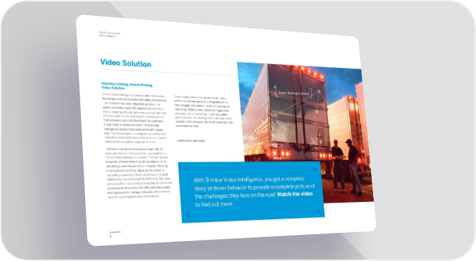 8 Trimble Transportation Video Intelligence Video Solution Trimble Video Intelligence solution offers tomorrow’s technology when it comes to fleet safety and security – all in one simple, fully integrated solution. The system provides a near 360-degree view around a truck, including left and right view cameras built into a truck’s spot mirrors and a trailer backup camera that wirelessly pairs with the tractor to livestream in-cab video. In November 2017, Trimble Video Intelligence solution also received the Minnesota High Tech Association’s prestigious Tekne Award for innovation and practical application to help improve safety for fleets and the roads we all share. The trailer backup camera uses a transmitter to automatically pair it to any tractor equipped with a Trimble Video Intelligence receiver. This pairing also allows for wireless streaming of live video on an in- cab display when the vehicle is in reverse, reducing blind spots for the driver. Because the system is not battery-powered, it never needs to be charged. Additionally, the position of the OEM-style side-view cameras offers more product durability, a field of view across two to three lanes of traffic and a steep angle to the ground eliminating blind spots, which are the second-most frequent cause of accidents. Industry-Leading, Award-Winning Video Solution Trimble Video Intelligence was the first solution on the market that can be fully integrated with a fleet management system. Trimble Onboard Event Recording® (OER) allows video to be triggered by company-controlled settings, including sudden acceleration or hard braking. An in-cab digital video recorder (DVR) wirelessly transmits videos from the connected cameras. (continued on next page) With Trimble Video Intelligence, you get a complete story of driver behavior to provide a complete picture of the challenges they face on the road. Watch the video to find out more. Trailer Backup Camera