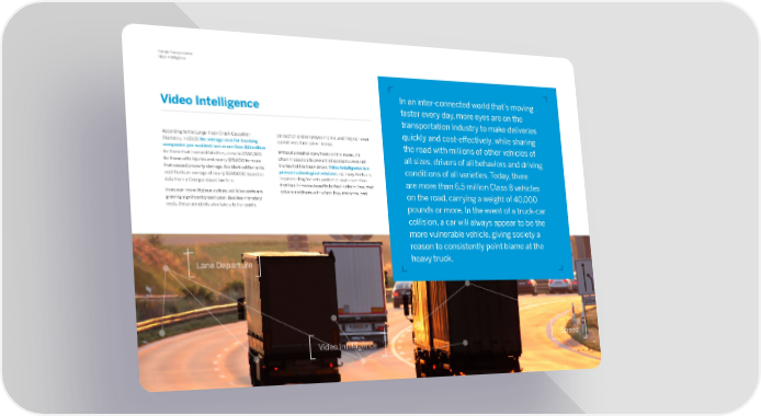 3 Trimble Transportation Video Intelligence Video Intelligence According to the Large Truck Crash Causation Statistics, in 2013, the average cost for trucking companies per accident was more than $11 million for those that involved fatalities, close to $500,000 for those with injuries and nearly $75,000 for ones that caused property damage. Accident settlements cost fleets an average of nearly $280,000, based on data from a Georgia-based law firm. In an ever more litigious culture, collision costs are growing significantly each year. Besides monetary costs, these accidents also take a toll on public perception and employee morale, and they can even cost drivers their job or license. Without a neutral eyewitness on the scene, it’s often impossible to prove that accidents were not the fault of the truck driver. Video Intelligence is a proven technological solution that many fleets are implementing for both protection and prevention that has immense benefits to their bottom lines, their drivers and those with whom they share the road. In an inter-connected world that’s moving faster every day, more eyes are on the transportation industry to make deliveries quickly and cost-effectively, while sharing the road with millions of other vehicles of all sizes, drivers of all behaviors and driving conditions of all varieties. Today, there are more than 6.5 million Class 8 vehicles on the road, carrying a weight of 40,000 pounds or more. In the event of a truck-car collision, a car will always appear to be the more vulnerable vehicle, giving society a reason to consistently point blame at the heavy truck. Video Intelligence Lane Departure Speed