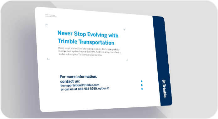 16 Trimble Transportation What to Look for in a TMS Never Stop Evolving with Trimble Transportation Ready to get started? Let’s talk about the right fit of a transportation management system for your business. Explore our low cost of entry, hosted subscription TMS and curated bundles. For more information, contact us: transportation@trimble.com or call us at 866-914-5299, option 2